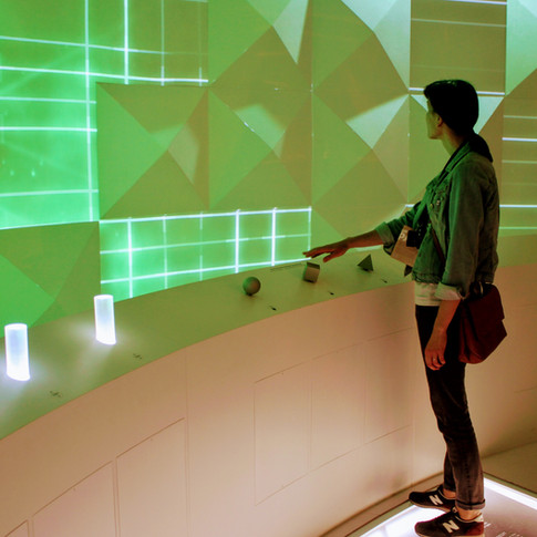 Pastatas yra trijų aukštų - dviejuose yra ekspozicija, pirmajame - parduotuvė, kavinė ir foje. Pradėjom nuo viršutinio aikšto, kur buvo didelis baltas kambarys, kuriame galima žaisti su garsais, vaizdais ir spalvomis: